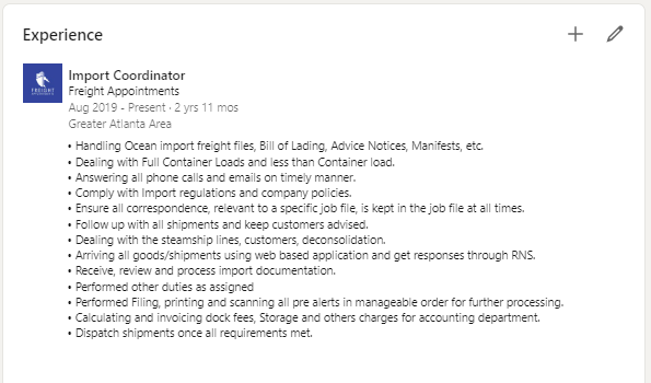 Leaving this area blank doesn’t give recruiters or hiring managers an idea of what your responsibilities were. Including a run-down of your duties will make people more likely to reach out, if they’re looking to speak to professionals with similar experience. It'll also make it easier for hiring managers to find you if they use the search facility to look for particular experience such as handling bills of lading, HAWBs etc.